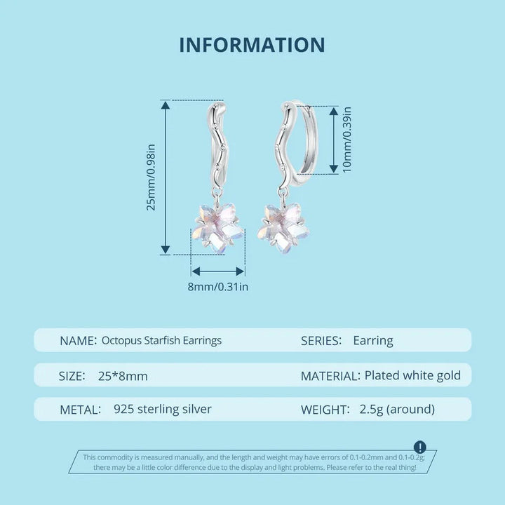 ? [Description] The earrings embedded with starfish shape glass is playful and whimsical as multiple coils of octopus tentacles being wrapped around. It symbolizes wealth from all directions as well as representing the beautiful meaning of absolute freedom and prosperity.